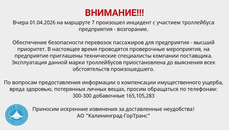 Вчера 01.04.2026 на маршруте 7 произошел инцидент с участием троллейбуса предприятия - возгорание.