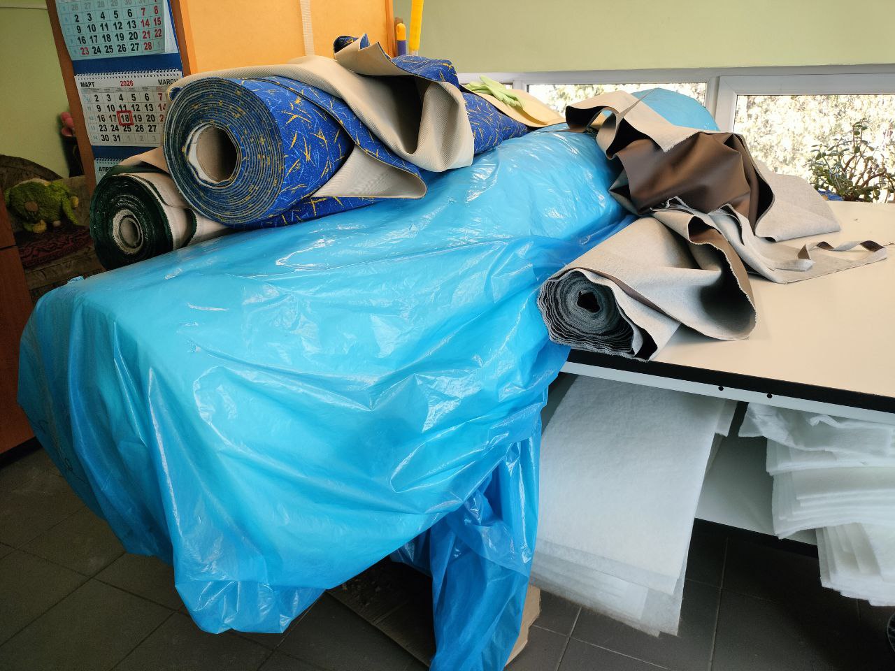 В цехе всегда кипит жизнь. У окна стоит большой стол для раскроя, заготовки лекал для разных моделей сидений, рулоны тканей и, конечно, верный помощник — рыжий кот Арсений, который живёт тут уже 15 лет и считается настоящим талисманом.